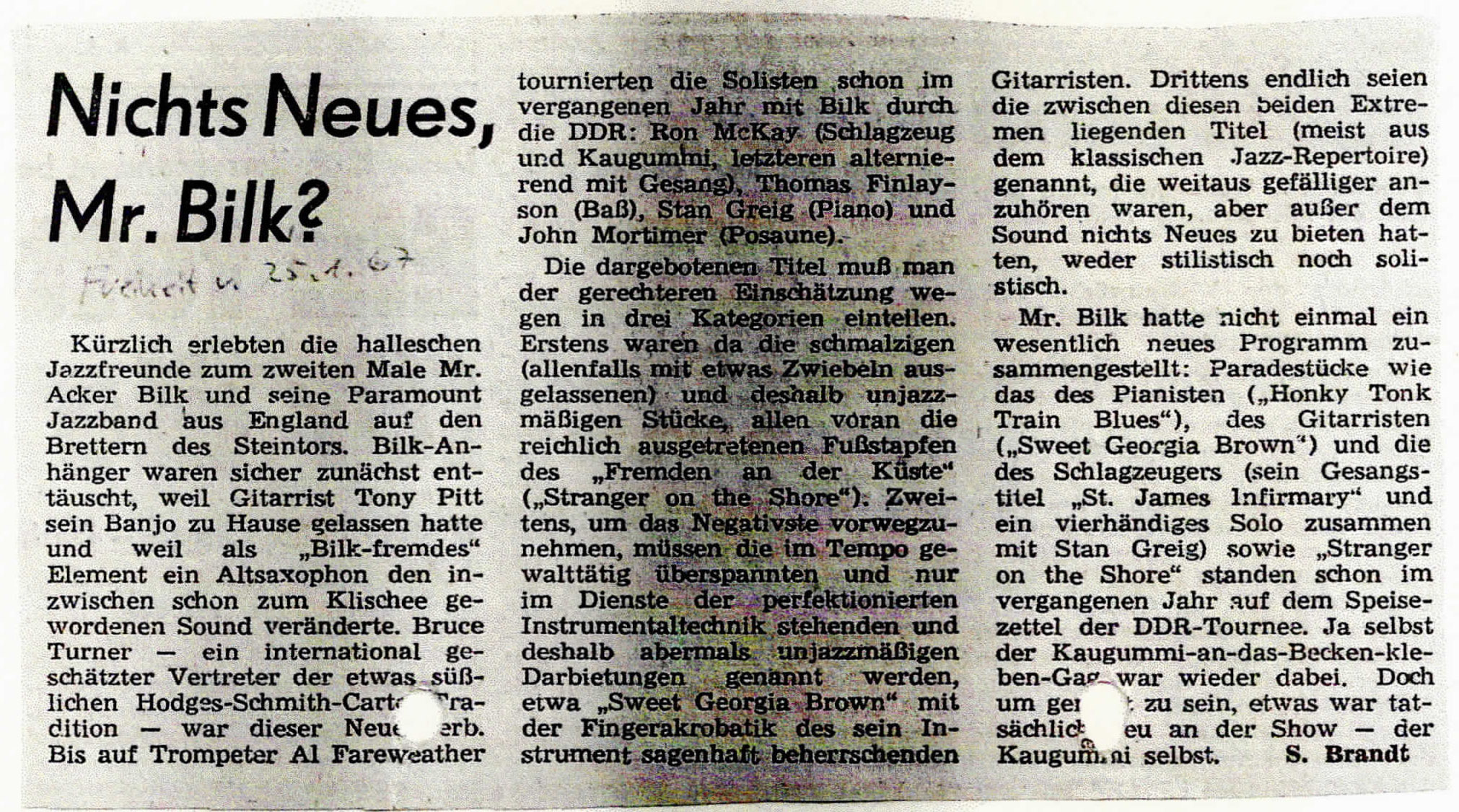 Mr. Bilk hatte nicht einmal ein wesentlich neues Programm zusammen gestellt: Paradestücke wie das des Pianisten (»Honky Tonk Train Blues«), des Gitarristen (»Sweet Georgia Brown«) und die des Schlagzeugers (sein Gesangstitel »St. James Infirmary« und ein vierhändiges Solo zusammen mit Stan Greig) sowie »Stranger on the Shore« standen schon im vergangenen Jahr mit auf dem Speisezettel der DDR-Tournee. Ja selbst der Kaugummi-an-das-Becken-kleben-Gag war wieder dabei. Doch um gerecht zu sein, etwas war tatsächlich neu an der Show – der Kaugummi selbst.